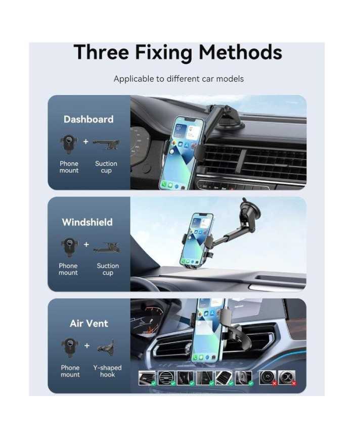 Con el soporte para teléfono 3 en 1 VENTION, no tienes que preocuparte por las condiciones climáticas. Utiliza la ventosa para los días fríos y el clip de ventilación para los días calurosos. Un soporte para teléfono que se adapta a todas tus necesidades de conducción.