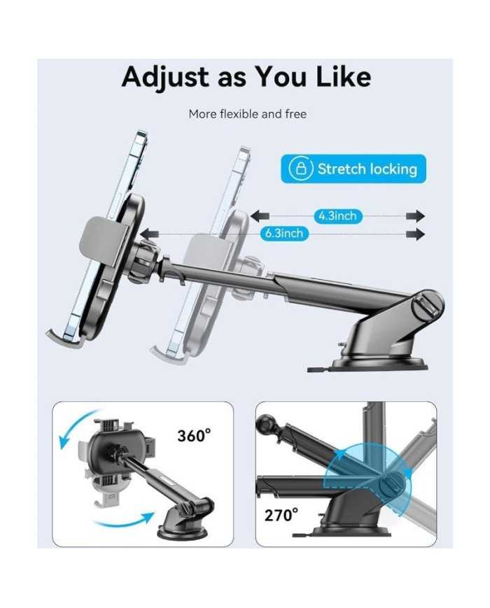 Personaliza tu experiencia de conducción con el brazo telescópico mejorado del soporte para teléfono VENTION. Se extiende de 11 a 16 cm y gira 270 grados para que puedas colocar tu teléfono en el ángulo perfecto y evitar que obstruya tu vista mientras conduces.