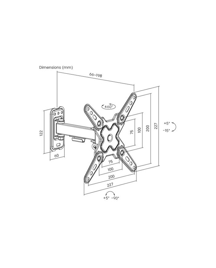 Se adapta a pantallas LED, LCD de 13 a 43. Distancia de TV a la pared 66-198mm Inclinacin arriba/abajo: +5 -15. Rotacin 60/-60 Soporta TV hasta 20Kg VESA 75x75, 100x100, 100x200, 200x100, 200x200 Organizador de cables.