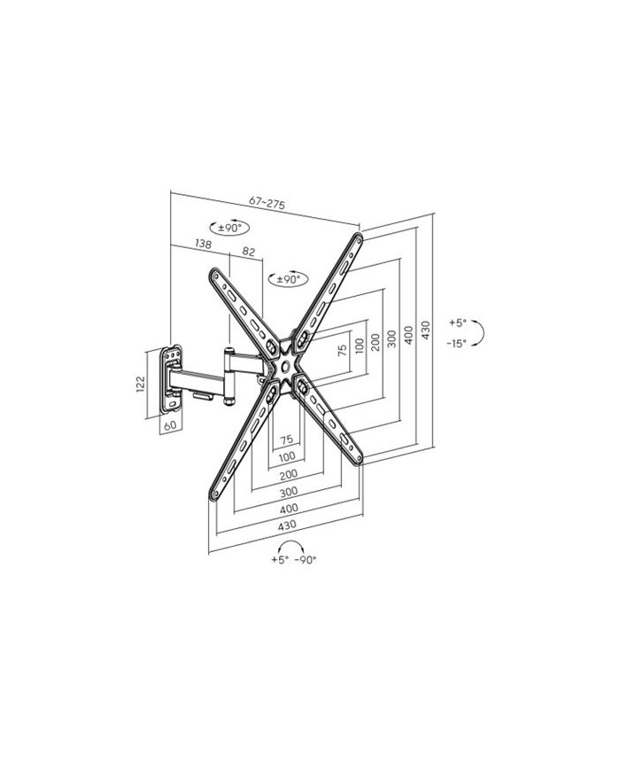 Se adapta a pantallas LED, LCD de 13 a 55. Distancia de TV a la pared 67-275mm Inclinacin arriba/abajo: +5 -15. Rotacin 90/-90 Soporta TV hasta 25Kg VESA: 75x75, 100x100, 100x200, 200x100, 200x200, 300x200, 400x200, 300x300, 400x300, 400x400 Organizador de cables.