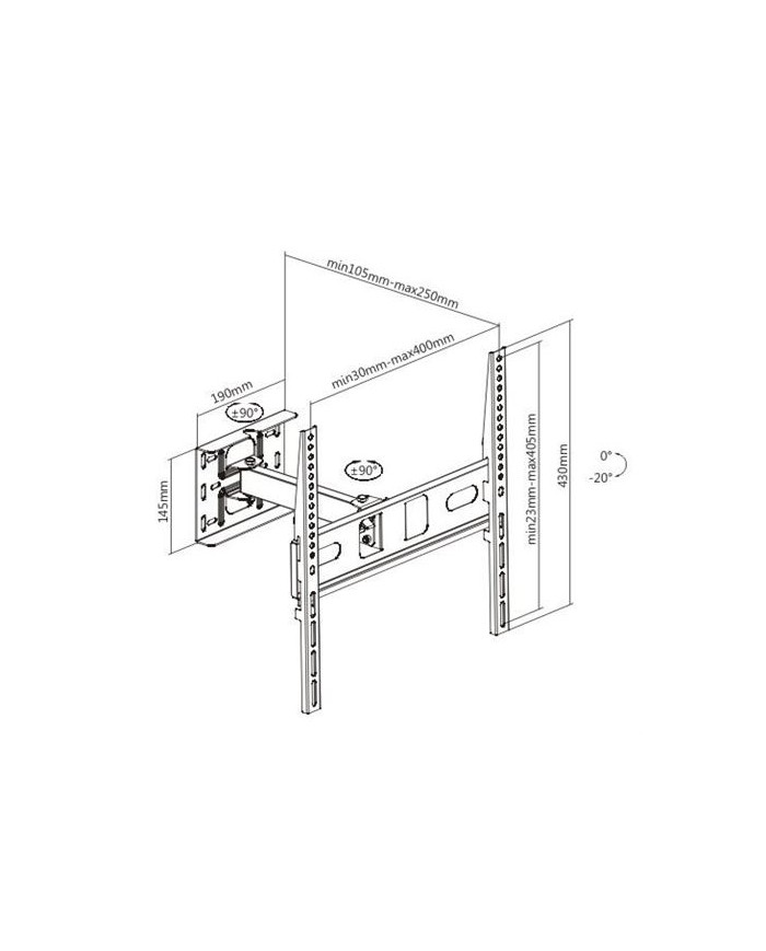 Se adapta a pantallas planas de 32 a 65. Capacidad de carga mxima: 25 KG. Distancia de TV a la pared: 105 - 250 mm. Inclinacin arriba/abajo: +0, -20 Rotacin de 90, -90 Organizador de cables VESA Compatible: 75x75, 100x100, 100X150, 150X100, 150x150, 200x100, 100X200, 200x200, 300x200, 300x300, 400x200, 400x300, 400x400