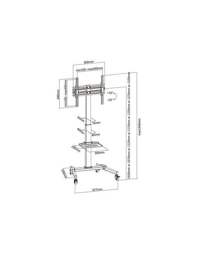 • Se adapta a pantallas LED, LCD de 32´ a 55´. • Inclinación arriba/abajo: +10º · -10º. • Capacidad de carga máxima: 35 KG. • Base móvil con 4 ruedas • Incorpora peana ajustable en altura. Peso máximo soportado 5Kg • Freno en dos de las ruedas • Apertura trasera para bajada de cableado por dentro del soporte • Alturas posibles: 1020mm / 1070mm / 1120mm / 1170mm / 1220mm / 1270mm / 1320mm • VESA 100x100, 200x100, 200x200, 300x200, 300x300, 400x200, 400x300, 400x400