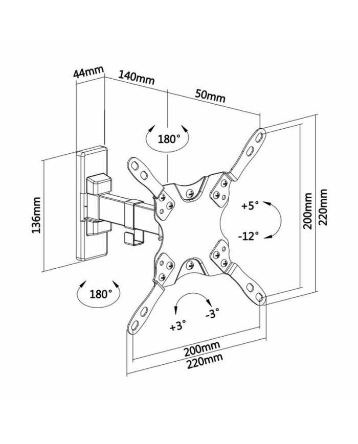 - Ángulo de Inclinación: -12º / +5º. Angulo de giro: -90º / 90º (depende de la instalación y del espacio disponible). Angulo de nivelación: -3º / +3º. Distancia de la pared: ajustable entre 60 y 190mm.
