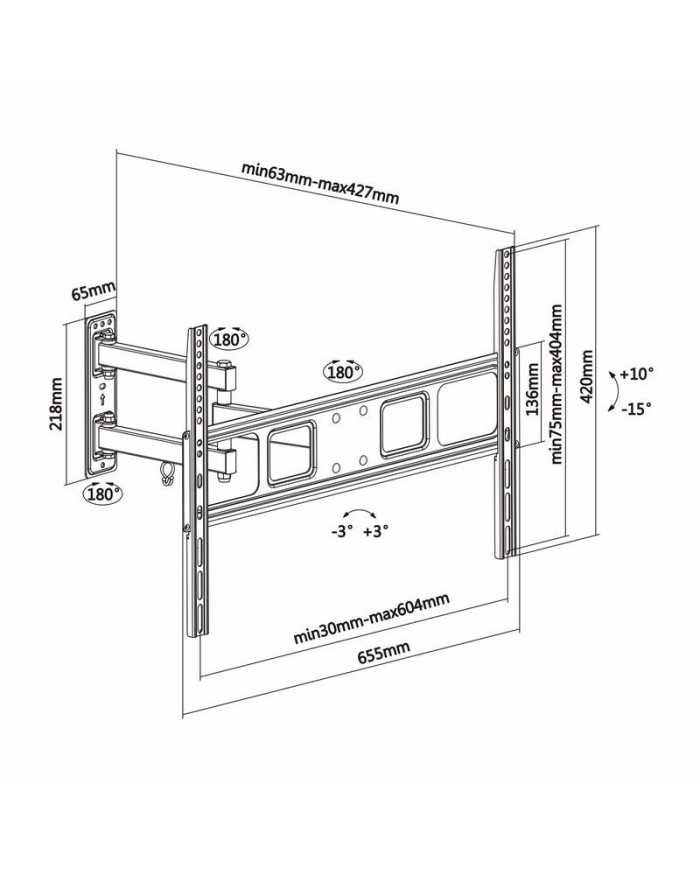 - Ángulo de nivelación: -3º / 3º. Distancia de la pared: ajustable entre 63 y 427 mm (depende de la instalación y del espacio disponible). Manual de instrucciones varios idiomas.