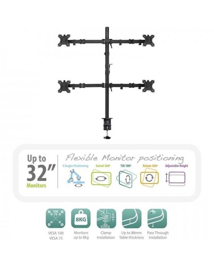 - Soporte de metal para 4 monitores de hasta 32 pulgadas y 8 kg cada uno.