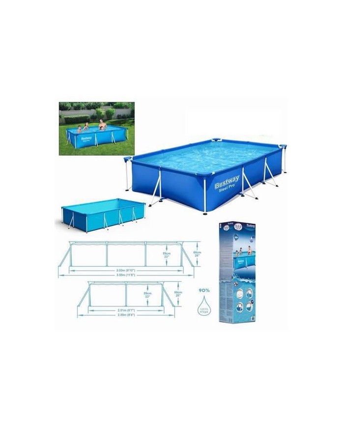 Dimensiones: 3,00 m x 2,01 m x 66 cm Capacidad de Agua (90%): 3.300 L Preprate para los clidos das del verano que llega y hazte con tu propia piscina Bestway. El revestimiento mejorado de 3 capas DuraPlus es un 15% ms resistente al desgarro, un 33% ms resistente al estiramiento y un 83% ms resistente a los pinchazos que el PVC estndar Tiene un marco de acero resistente a la corrosin que se mantiene unido gracias a nuestro FrameLink System. Este sistema le proporciona una buena resistencia y conexin. Y es fcil de montar y desmontar sin necesidad de herramientas. Contenido: 1 piscina, 1 parche de reparacin