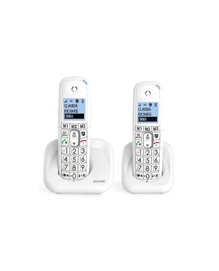 •Marca: Alcatel •Tipo: Teléfono DECT/analógico •Tipo de auricular: Terminal inalámbrico •Altavoz •Rango máximo en interiores: 50 m •Rango máximo en exteriores: 300 m •Capacidad de lista de direcciones: 100 entradas •Identificador de llamadas •Color del producto: Blanco •Número de teléfonos móviles incluidos: 2