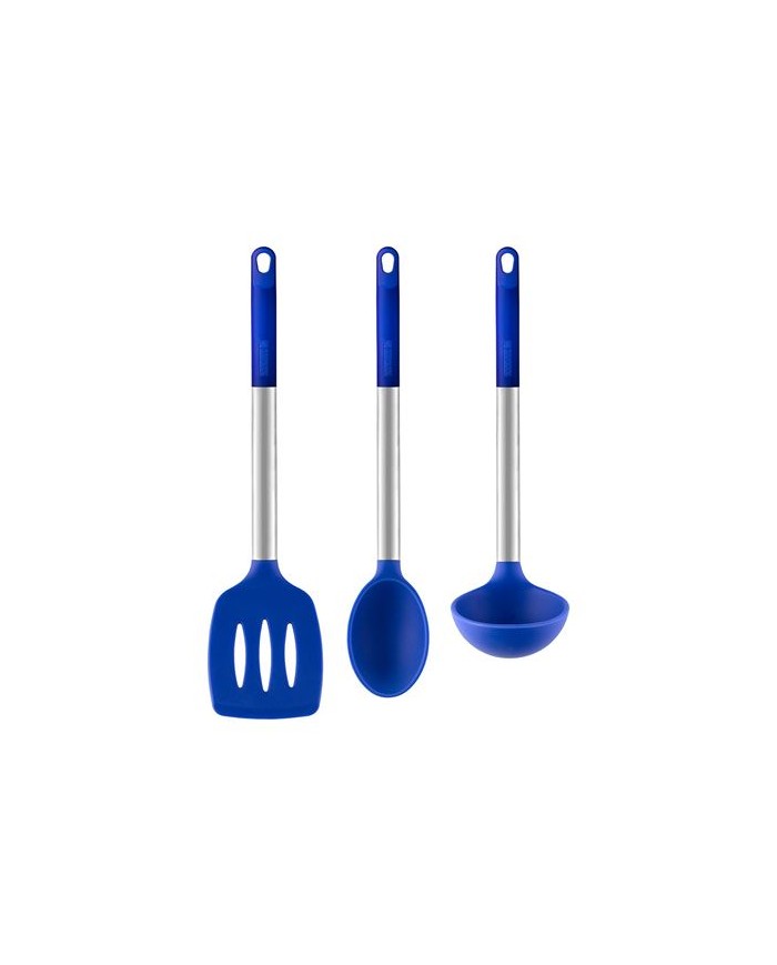 Juego formado por 3 utensilios fabricados en silicona de alta calidad, nylon y acero inoxidable 18/10 con un colorido diseo en azul elctrico que le dar un toque alegre a la cocina. Son resistentes hasta 200C y perfectos para utilizar con todo tipo de sartenes, ollas y cacerolas, con o sin recubrimiento antiadherente. De fcil limpieza y aptos para el lavavajillas.